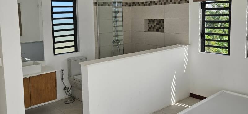 Résidence sécurisée, proche de la Croisette - entièrement de plein pied - 3 à 4 places de parkings dont un carport - 1 entrée - toilette visiteurs - grand séjour/salle à manger - une cuisine ouverte sur séjour cellier/buanderie - une master bed room avec dressing équipé et sanitaire privatif - 2 bed room en suite le tout entièrement ventilé et climatisé - grande terrasse donnant sur piscine plage en deck bois avec vue dégagé et imprenable vers la Croisette au loin, jardin intimiste - possibilité de mezzanine - guess room avec entrée indépendante - chauffe eau solaire - citerne d'eau privative plus réserve d'eau collective - possibilité de collecte d'eau de pluie.